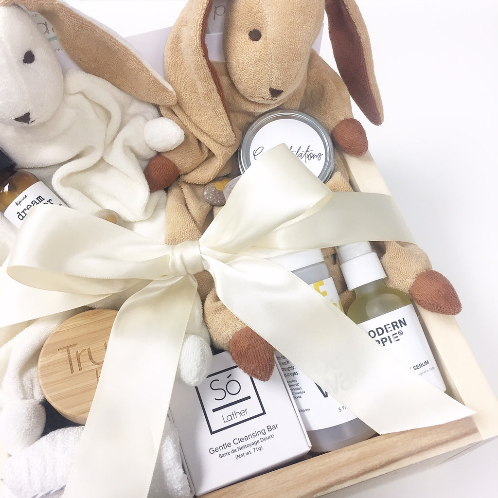 This crate is ideal to give to expectant/new parents as a group shower gift. We can even include something for the proud big brother or sister.